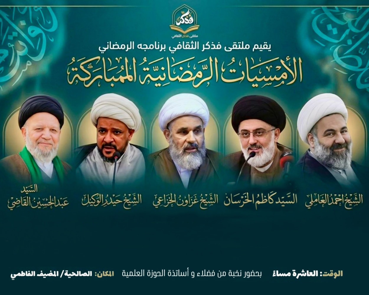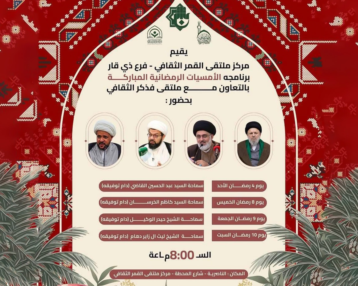 سأتشرف بالحضور والمشاركة ضمن برامج الأمسيات الرمضانية المباركة في مدينة الناصرية، يوم الخميس الثامن من شهر رمضان المبارك، الموافق 2026/2/26، في مركز ملتقى القمر الثقافي وملتقى فذكر الثقافي.